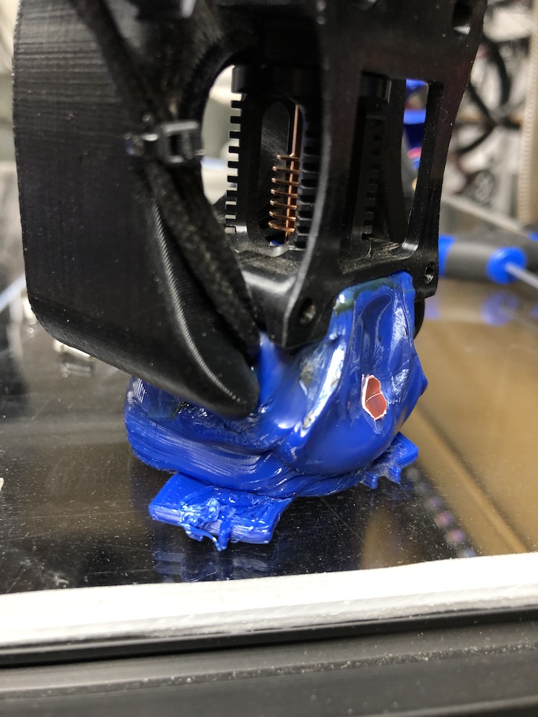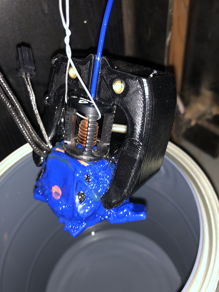 - With some solid steel or copper wire, suspend what is left of the toolhead by the hot end itself from the lid of the container.