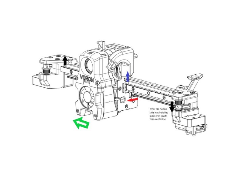 - If the front rail is slightly misaligned higher on the left/lower on the right (black arrows), it will pull up on the carriage (gray arrow) when moved to the left (green arrow). The bottom rail is constrained in that direction, so it moves forward(red arrow), and the carriage is tilted.